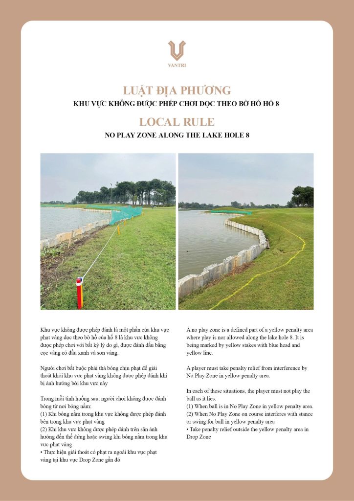 A no play zone is a defined part of a yellow penalty area where play is nor allowed along the lake hole 8. It is being marked by yellow stakes with blue head and yellow line.