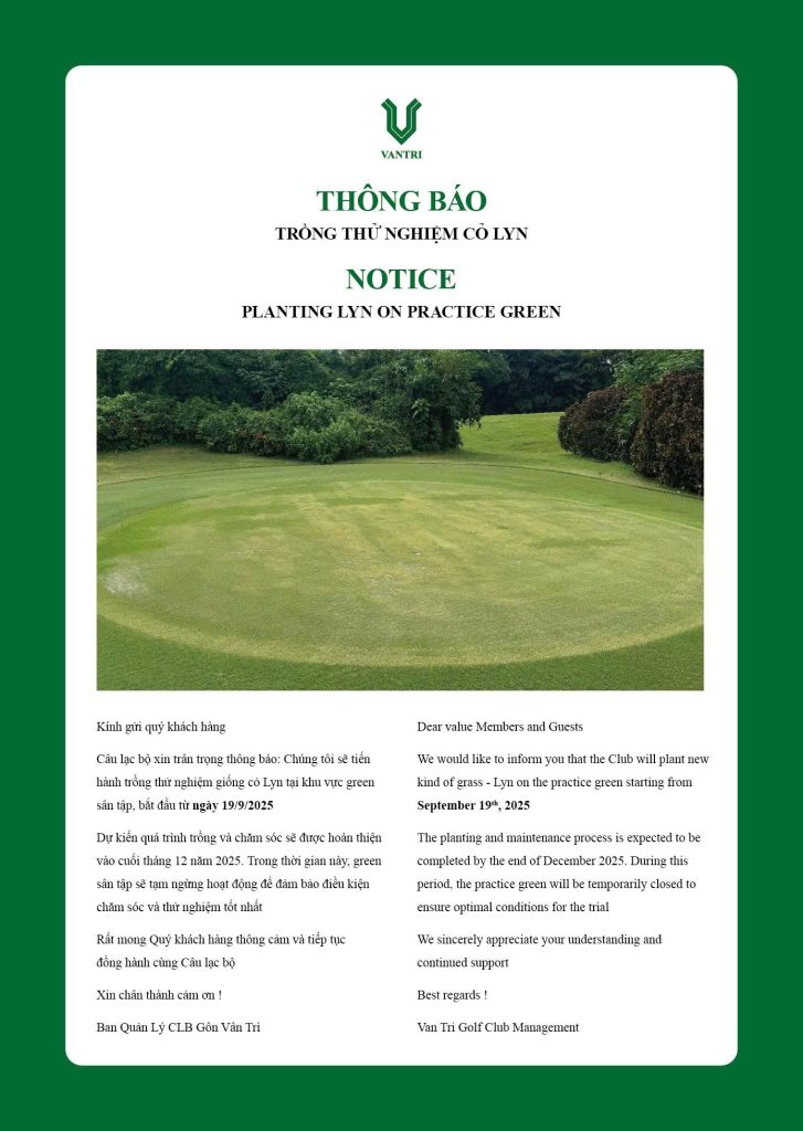 We would like to inform you that the Club will plant new kind of grass – Lyn on the practice green starting from September 19th, 2025.